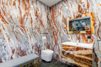 -Первый этаж: большая прихожая, холл, гостевая комната, кухня-столовая, санузел, постирочная, кладовая, терраса;