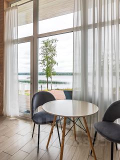кондиционер ,мангал,комплект постельного белья, полотенца, настольные игры, кроватка-манеж для самых маленьких.Есть два шезлонга и собственный пляж где можно позагорать , отдохнуть и искупаться .Можно взять в прокат лодку( бесплатно ) ,сап серф.Есть детский уголок на территории.