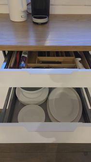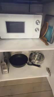 Из техники в доме есть: микроволновка, индукционная плита, холодильник, посудомоичная машина, кофемашина, чайник.