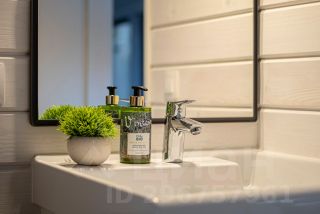 В ванне - душ с хорошим напором воды, пол с подогревом, мыло, шампунь. Есть стиральная машина, стиральный порошок при необходимости.