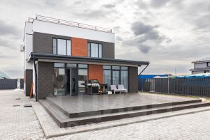 Полностью огороженный забором участок, на котором расположен гараж для автомобиля. Подъезд к дому выложен из брусчатки. Ворота - откатные на пульте управления.