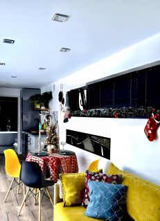 Кухня гостиная: камин с панорамным стеклом, посуда на 4 персоны, плита, духовой шкаф, холодильник, микроволновая печь, чайник, экран с электроприводом и проектором, раскладной диван.