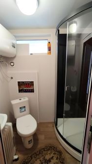 Площадь дома 37 кв. м., включает жилую комнату, кухню, совмещённый санузел с душевой кабиной и террасу с панорамным остеклением.