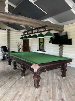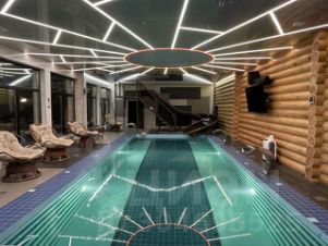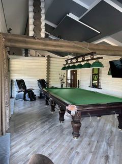 На первом этаже расположены обеденная зона с кухней и двумя столами, настоящий домашний кинотеатр с проектором и крутым звуком, целый спа комплекс с 11 метровым бассейном, хамом, сауной ,солярием и спортзалом, игровая комната с русским бильярдом.