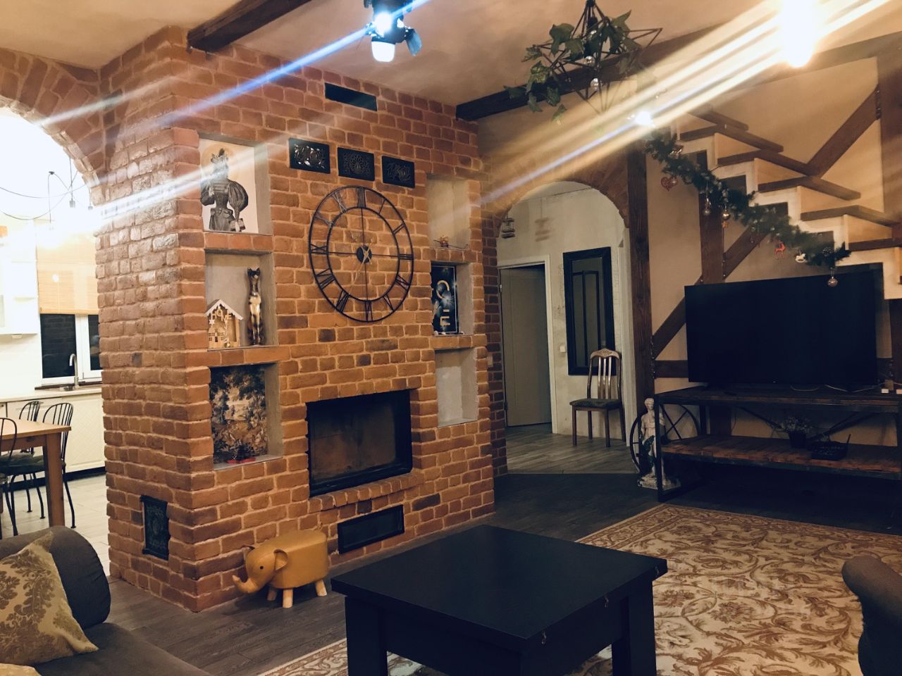 На первом этаже гостинная с камином, просторная кухня, санузел с джакузи , спальня, везде тёплые полы