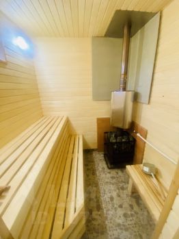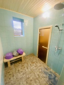 Баня 90 м (второй дом на фото). В ней парная с печью на дровах, санузел и зона отдыха на втором этаже