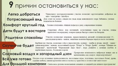 Понаблюдайте за прилетающими на участок птицами, насладитесь звездным небом и завораживающей водной гладью озера Забавное с высокого балкона в уютных креслах с чашечкой ароматного чая или бокалом согревающего напитка. У нас круглый год с удовольствием проводят романтический и семейный отпуск, уютные дни и вечера в окружении самых близких и дорогих людей. Наш формат созерцания природы и общего умиротворения не подойдёт шумным компаниям и вечеринкам.
