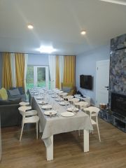 Дом с русской баней в доме. участок 18 сот в п. Поляны. В 60 км от Санкт-Петербурга. В доме четыре изолированных спальни. Кухня - гостиная с камином и большим раскладным диваном. Огороженная территория. Парковка на четыре машины. Большая открытая терасса 40 м. кв. с обеденной зоной. Баня на дровах в доме, входит в стоимость проживания. Для детей на улице батут, качели. Просторная кухня-гостиная с раздвижным столом на 10 персон, телевизором, раскладным диваном и креслами. Кухня укомплектована посудой и инвентарем.Есть холодильник, микроволновка,духовка, индукционная плита, чайник,электрогриль,тостер,блендер . Два совмещенных санузла с душевыми кабинами. Предоставляются постельное белье и полотенца. Для готовки на улице, есть мангал, печь с казаном, решетки и шампура. Вся инфраструктура, магазины пятерочка, магнит, кафе шаверленд, суши смайл находятся в 5 мин езды на автомобиле. Дом расположен в районе 'Семиозерья". Окружен россыпью озер. В пешей доступности находятся озера для рыбалки и купания. Ближайший песчаный пляж в 10 мин ходьбы. В 15мин глубокое и чистейшее озеро "Длинное"с прокатом и школой дайвинга. Можно прогуляться по экомаршруту "Пароги реки Гладышевки". Горнолыжный склон "Пухтолова гора" в 30 мин. езды на автомобиле. От м Просвещения до дома ходит 827 маршрутка. У нас проводят: дни рождения, дружеские встречи, не шумные вечеринки. Мы особенно рады семьям с детьми. Курение в доме запрещено.Цена в объявлении за 10спальных мест.дополнительные места-1500 руб/ сутки по согласованию. Проживание с животным до 30 см.в холке 1000 руб сутки. Депозит 6000 руб ( возвращается в день выезда при условии чистоты, порядка и сохранности имущества.