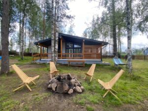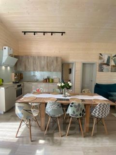 Дом одноэтажный, просторный с большой крытой террасой, с панорамными окнами, 3-мя спальнями и кухней-гостиной. Диван в гостиной раскладывается 2-х спальный, в спальнях кровати 140*200 и 140*200, в детской двуярусная кровать 90*200 с выдвижным доп.местом 80*190. Постельное бельё и полотенца входит в стоимость проживания.