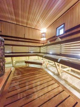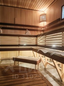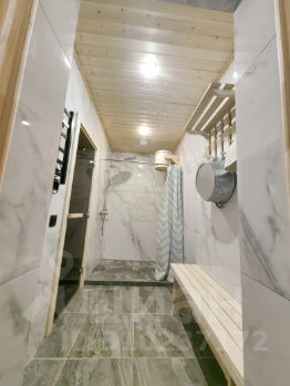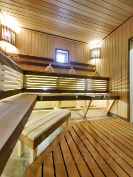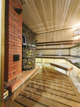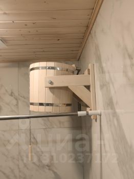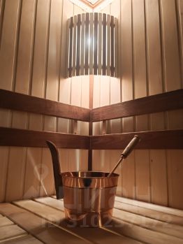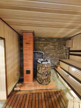 Дровяная баня с большой парилкой, душевой, санузлом и обливочным ведром, а также гостиная с кухней, посудой, холодильником, обеденным столом и стульями.
