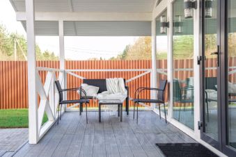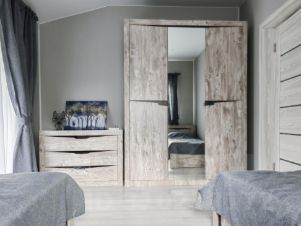 Коттедж включает в себя две изолированные спальни, санузел с душевой кабиной, просторную светлую кухню-гостиную с панорамными окнами и выходом на террасу. Терраса идеально подходит для отдыха на свежем воздухе, для себя вы там найдёте уютный диванчик, кресла и кофейный столик.
