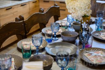 Мангальная зона с решетками и шампурами. В крытой террасе с мебелью старинного замка.