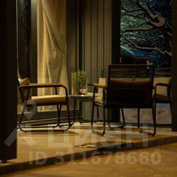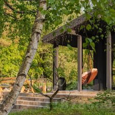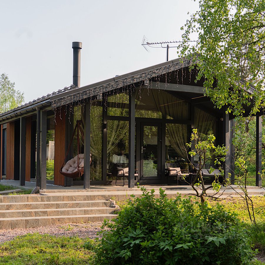 — Терраса с гамаком, диванчиком и креслами под крышей