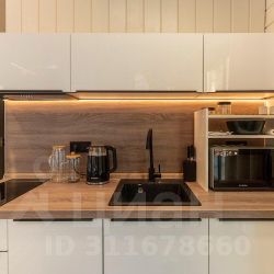 — Уютная кухня с техникой: ПММ, СВЧ, варочная панель, холодильник