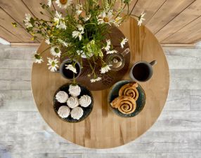 - Круглый уютный обеденный стол из натурального дерева + 4 удобных стула
