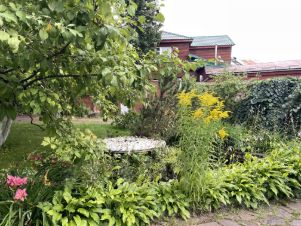 Очаровательный сад с ландшафтным дизайном и фонтаном, создающий атмосферу уюта.