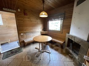 Зона отдыха с большим столом и камином, где можно расслабиться после парной.
