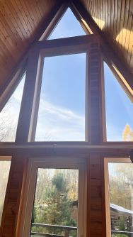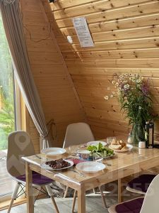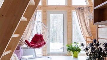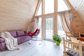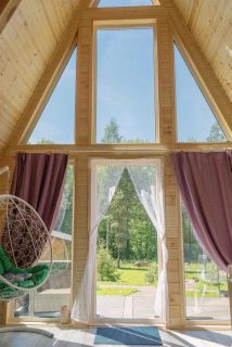 - Гостиная с панорамными окнами в пол с видом на лес (в гостиной: ЖК телевизор, подвесное кресло/кокон с подсветкой, диван/кровать с независимым пружинным блоком и ортопедическим основанием, комод);