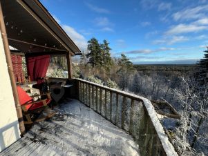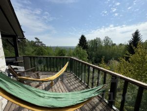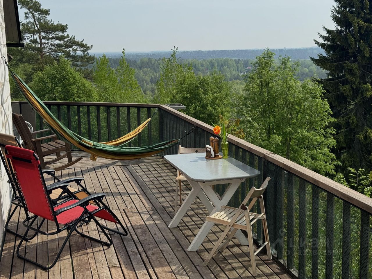 Большая видовая терасса со столом и стульями. Кресло качалка, два шезлонга и два гамака.