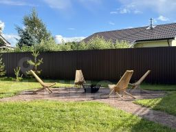 Дом по периметру обнесен глухим забором (поставлен летом 2025). Имеются комфортные деревянные кресла и костровая чаша для вечернего релакса и уединения с природой