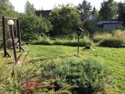 Приятный задний дворик со скамейкой и качелями. Подойдет для семейного доверительного и спокойного отдыха.