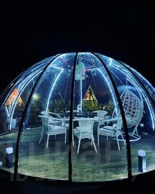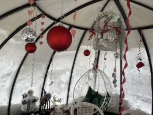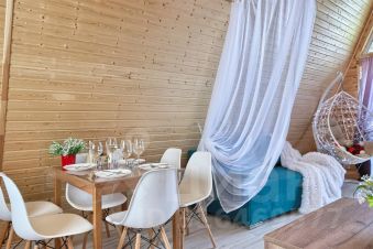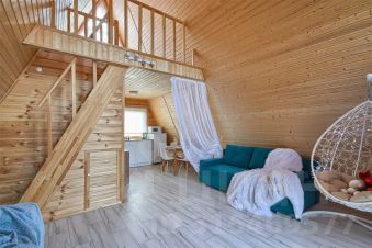 - Гостиная с панорамными окнами в пол с видом на лес (в гостиной: ЖК телевизор, подвесное кресло/кокон с подсветкой, два дивана/кровати с независимыми пружинными блоками и ортопедическим основанием, комод);