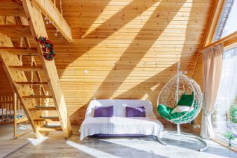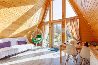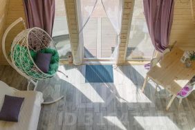 - Гостиная с панорамными окнами в пол с видом на лес (в гостиной: ЖК телевизор, подвесное кресло/кокон с подсветкой, диван/кровать с независимым пружинным блоком и ортопедическим основанием, комод);