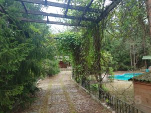 Дом находится в середине сухого и ровного участка площадью 12 соток, разделяя его на две части. Фасадная часть, начинается от ажурных металлических въездных ворот. Практически полностью сохраненный фрагмент хвойного леса органично дополнен диким виноградом благодаря системе декоративных садовых конструкций- пергол.
