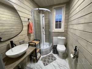 • Два санузла с туалетом и душем, а также все необходимые принадлежности — полотенца, фен, мыло, шампунь и гель для душа. Для вашего удобства в доме есть стиральная и сушильная машины, гладильная доска с утюгом.