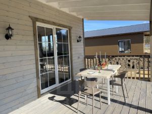 • Большая терраса (25 кв. м) — идеальное место для утреннего кофе или вечерних посиделок. Во дворе обустроена мангальная зона с кострищем для барбекю. Шампура и решетка предоставляется. А для любителей парной мы предлагаем баню (оплачивается отдельно).
