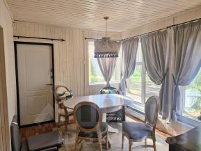 Оснащенная кухня с посудомоечной машиной и столовая зона с выходом к шатру и видом на нетронутый человеком кусок комарово. Особенную прелесть ей дает полная обособленность - перед вами только лес и птицы!