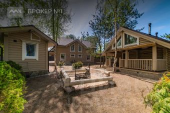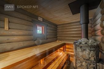 На участке площадью 12 соток есть детская площадка, навес для автомобилей, беседка, костровая зона и бревенчатая баня с зоной отдыха и настоящим винным погребом.