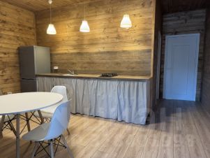 - Кухня полностью оборудована для длительного и комфортного проживания (холодильник, микроволновка, варочная панель, обеденный стол, посуда для готовки и сервировки);