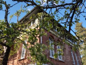 Двухэтажный дом с просторной террасой с видом на сад и лес.