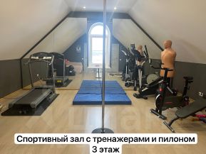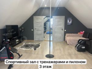 ТРЕТИЙ этаж 50,1 м.кв.спортивная комната с пилоном , тренажерами, диван, телевизор,гардеробная укоплектована полками . стелажами Дом полностью готов к проживанию,оснащен мебелью и техникой. Отпление теплые полы