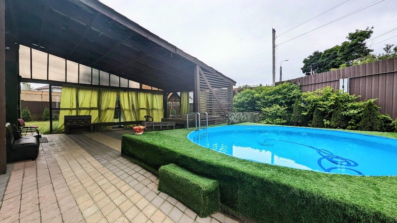 Коттедж, дом с большим бассейном .(ДОМ - КАРАОКЕ для вечеринок и диско с уютной большой верандой навесом. Профессиональная сценическая акустика, светомузыка идеально для корпоративов, дней рождения и выездных свадеб и просто для спокойного семейного отдыха. архитектурный свет и ландшафт территории, большая парковка, : на первом этаже большая гостиная объединенная с кухней-столовой. Отдельная спальня. Также санузел, и гардеробная.