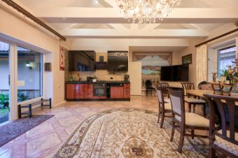 • Кухня-столовая: Просторная и светлая, с высокими потолками и необходимой техникой.