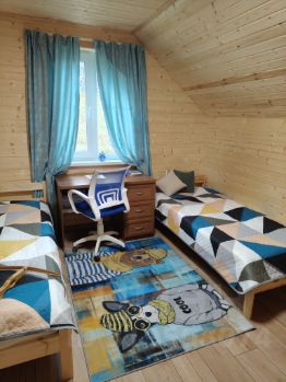 2 этаж - в холле стеллаж с литературой для детей и взрослых. Огромная спальня с двухспальной кроватью (ортопедический матрас), небольшой угловой диван (разбирается) , детская спальня с двумя односпальными кроватями.