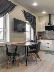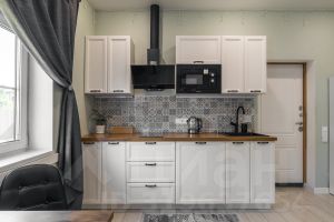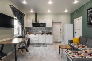 кухня-гостиная, оснащенная современной встроенной техникой,