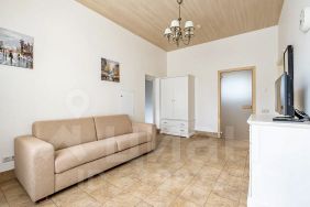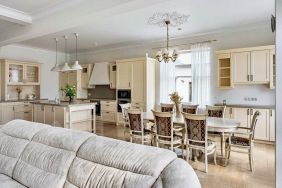 просторная кухня-гостиная с удобным диваном и большим обеденным столом;