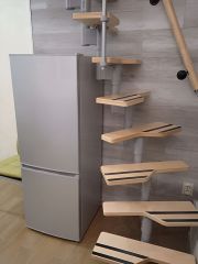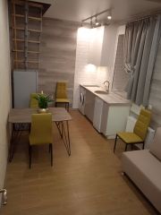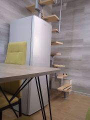 Общая площадь апартаментов: 42 м2. (из них на первом этаже: санузел — 2,2 м2, прихожая — 1,8 м2, кухня/столовая — 15.5 м2. На втором этаже, спальня 22.5 м2).