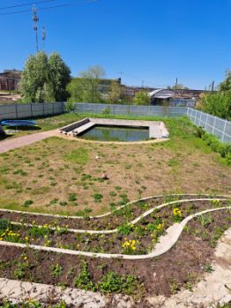 На территории есть полностью крытая беседка с мангальной зоной (шампура, решетка, казан, коптильня есть), так же пруд с проточной водой для купания после бани, батут для детей.
