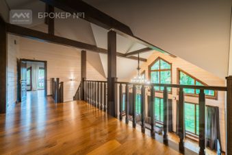 Дом общей площадью 460 квадратных метров располагается в тихой и отдаленной части поселка прямо на берегу живописного пруда с рыбками.