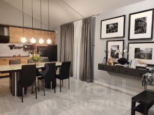 - Просторная гостиная-кухня с большим столом и диваном и ТВ.