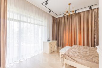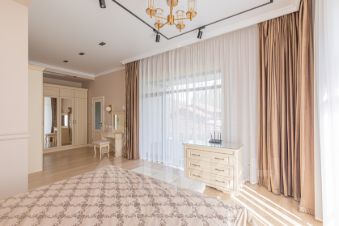 • Родительская спальная укомплектована большой кроватью с матрасом, Комодом, Шкафом для хранения вещей, отдельным сан. узлом с ванной, а также унитазом-беде. Из родительской комнаты есть выход на балкон-террасу.
