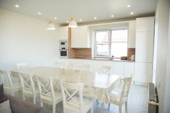 Просторная кухня-гостиная объединяет зону приготовления и отдыха, позволяя проводить время всей компанией.