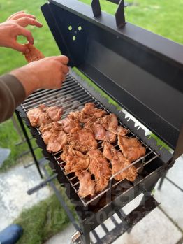 Участок огорожен забором, построена беседка, украшенная ретролампочками, мангальная зона с BBQ, организована парковка