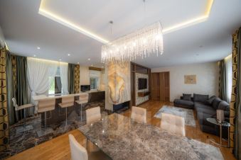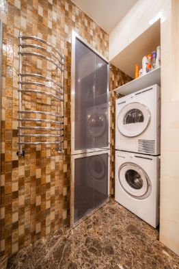 Ремонт делали для себя поэтому на материалах не экономили, все премиум-класса: итальянские двери, в отделке использовался мрамор, паркетная доска, теплые полы, панно из оникса с подсветкой, бытовая техника Neff, Bosch, холодильные системы и винный шкаф Liebherr, стиральная и сушильная машина Asko, сантехника Villeroy&Boch, Hansgrohe и пр.