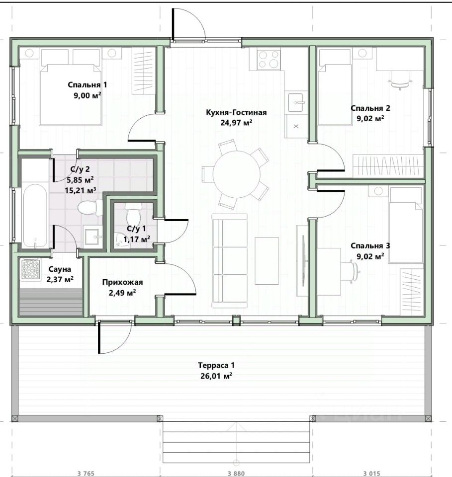 Просторную террасу площадью 26 м², где приятно проводить вечера на свежем воздухе.