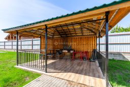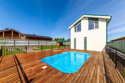 На участке есть всё необходимое для комфортного отдыха и жизни: баня, бассейн, мангальная зона, детская площадка. Коммуникации включают электричество, водоснабжение, газ и канализацию. Дом построен из монолитных материалов, что гарантирует его надёжность и долговечность.